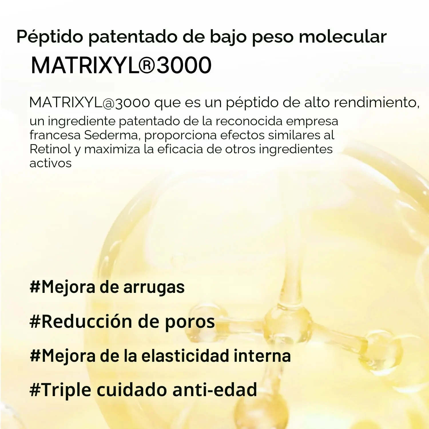 Efecto Botox-Like: Enriquecido con Matrixyl 3000 y péptidos tensores que devuelven la elasticidad perdida, logrando un efecto lifting y firmeza palpable.