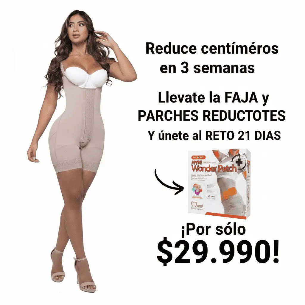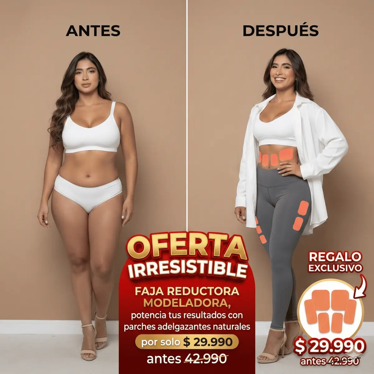 Tus clientas obtienen la satisfacción inmediata de verse más delgadas gracias a la faja (lo que sube la autoestima y motivación), mientras el parche trabaja en la reducción real de centímetros a lo largo del reto de 21 días.